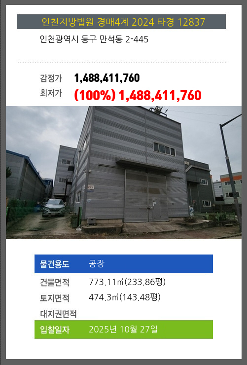 사건번호 2024 타경 12837 본건은 인천광역시 동구 만석동 2-445소재하는 공장경매 물건의 포스팅입니다. 건물면적 [ 773.11㎡ (233.86평) ]토지면적 [ 474.3㎡ (143.48평) ] 시세를 반영한 감정가 1,488,411,760에서신건으로