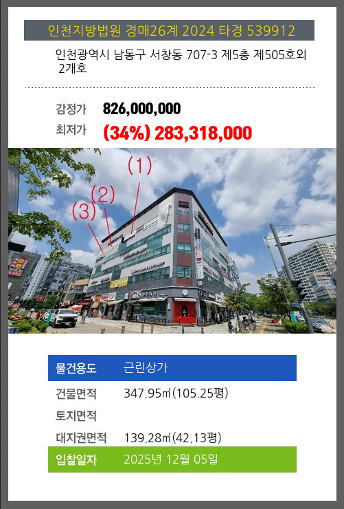 사건번호 2024 타경 539912 본건은 인천광역시 남동구 서창동 707-3 제5층 제505호외 2개호소재하는 근린상가경매 물건의 포스팅입니다. 건물면적 [ 347.95㎡ (105.25평) ]대지권 [ 139.28㎡ (42.13평) ] 시세를