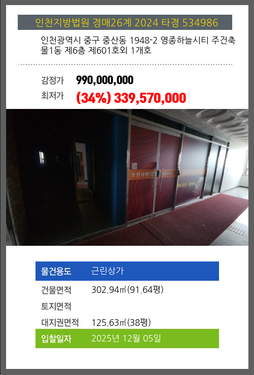 사건번호 2024 타경 534986 본건은 인천광역시 중구 중산동 1948-2 영종하늘시티 주건축물1동 제6층 제601호외 1개호소재하는 근린상가경매 물건의 포스팅입니다. 건물면적 [ 302.94㎡ (91.64평) ]대지권 [ 125.63㎡ (38평)