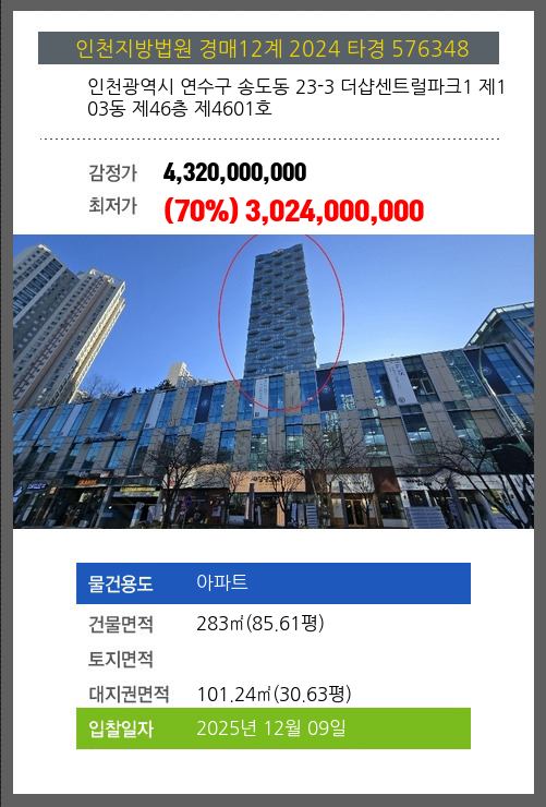 사건번호 2024 타경 576348 본건은 인천광역시 연수구 송도동 23-3 더샵센트럴파크1 제103동 제46층 제4601호소재하는 아파트경매 물건의 포스팅입니다. 건물면적 [ 283㎡ (85.61평) ]대지권 [ 101.24㎡ (30.63평) ]