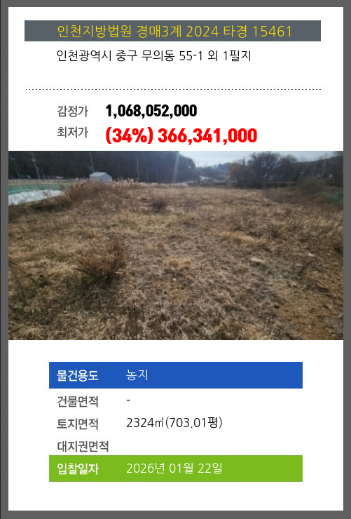 사건번호 2024 타경 15461 본건은 인천광역시 중구 무의동 55-1 외 1필지소재하는 농지경매 물건의 포스팅입니다. 토지면적 [ 2324㎡ (703.01평) ] 시세를 반영한 감정가 1,068,052,000에서3회 유찰되어 감정가