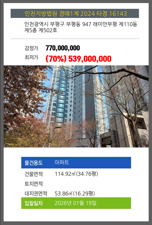 사건번호 2024 타경 16143 본건은 인천광역시 부평구 부평동 947 래미안부평 제110동 제5층 제502호소재하는 아파트경매 물건의 포스팅입니다. 건물면적 [ 114.92㎡ (34.76평) ]대지권 [ 53.86㎡ (16.29평) ]