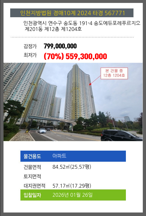 사건번호 2024 타경 567771 본건은 인천광역시 연수구 송도동 191-4 송도에듀포레푸르지오 제201동 제12층 제1204호소재하는 아파트경매 물건의 포스팅입니다. 건물면적 [ 84.52㎡ (25.57평) ]대지권 [ 57.17㎡ (17.29평) ]