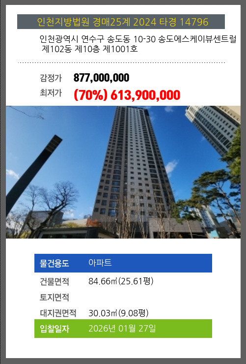 사건번호 2024 타경 14796 본건은 인천광역시 연수구 송도동 10-30 송도에스케이뷰센트럴 제102동 제10층 제1001호소재하는 아파트경매 물건의 포스팅입니다. 건물면적 [ 84.66㎡ (25.61평) ]대지권 [ 30.03㎡ (9.08평) ]