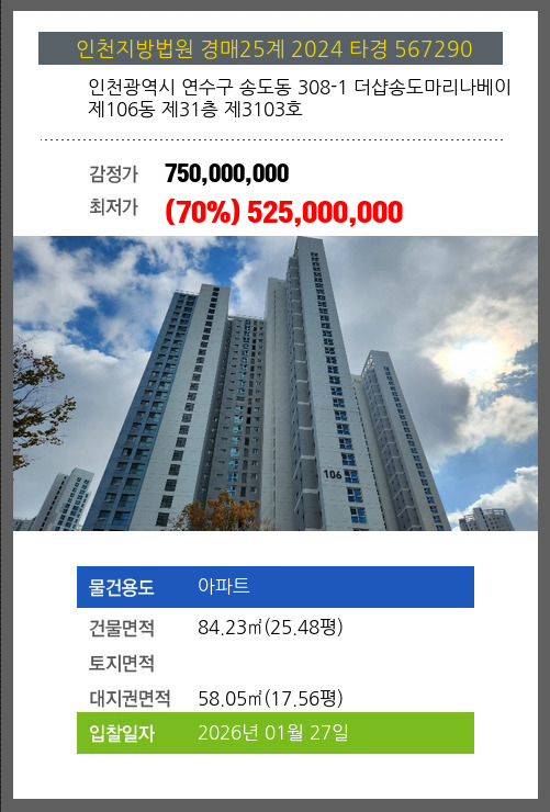 사건번호 2024 타경 567290 본건은 인천광역시 연수구 송도동 308-1 더샵송도마리나베이 제106동 제31층 제3103호소재하는 아파트경매 물건의 포스팅입니다. 건물면적 [ 84.23㎡ (25.48평) ]대지권 [ 58.05㎡ (17.56평) ]