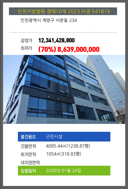 사건번호 2023 타경 541819 본건은 인천광역시 계양구 서운동 234소재하는 근린시설경매 물건의 포스팅입니다. 건물면적 [ 4095.44㎡ (1238.87평) ]토지면적 [ 1054㎡ (318.83평) ] 시세를 반영한 감정가 12,341,428,800에서1회