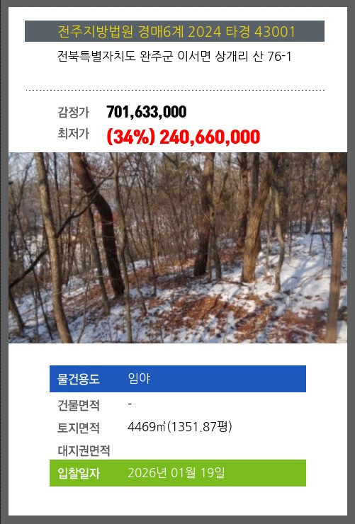 사건번호 2024 타경 43001 본건은 전북특별자치도 완주군 이서면 상개리 산 76-1소재하는 임야경매 물건의 포스팅입니다. 토지면적 [ 4469㎡ (1351.87평) ] 시세를 반영한 감정가 701,633,000에서3회 유찰되어 감정가