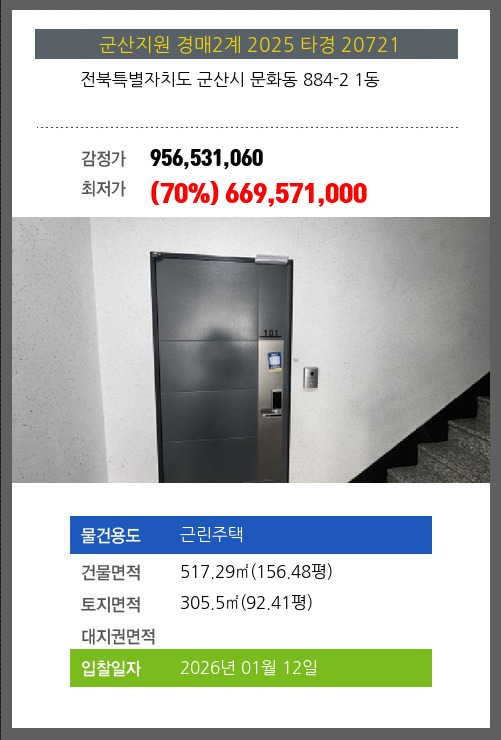 사건번호 2025 타경 20721 본건은 전북특별자치도 군산시 문화동 884-2 1동소재하는 근린주택경매 물건의 포스팅입니다. 건물면적 [ 517.29㎡ (156.48평) ]토지면적 [ 305.5㎡ (92.41평) ] 시세를 반영한 감정가