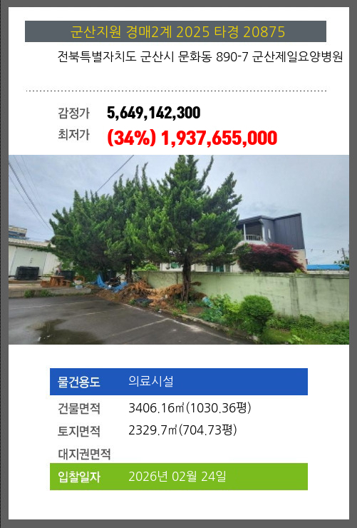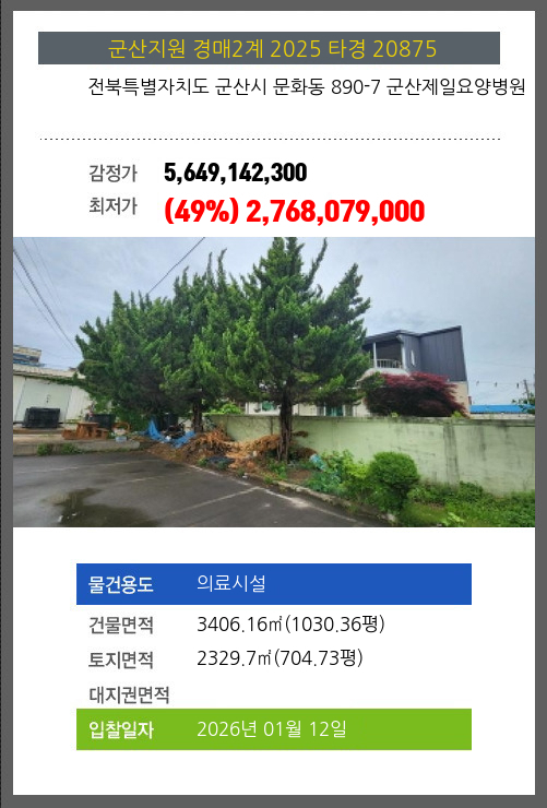 사건번호 2025 타경 20875 본건은 전북특별자치도 군산시 문화동 890-7 군산제일요양병원소재하는 의료시설경매 물건의 포스팅입니다. 건물면적 [ 3406.16㎡ (1030.36평) ]토지면적 [ 2329.7㎡ (704.73평) ] 시세를 반영한 감정가