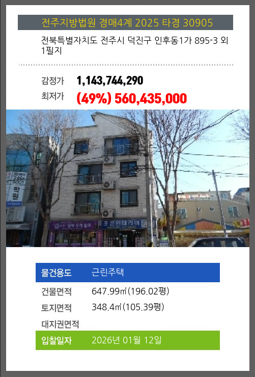 사건번호 2025 타경 30905 본건은 전북특별자치도 전주시 덕진구 인후동1가 895-3 외 1필지소재하는 근린주택경매 물건의 포스팅입니다. 건물면적 [ 647.99㎡ (196.02평) ]토지면적 [ 348.4㎡ (105.39평) ] 시세를