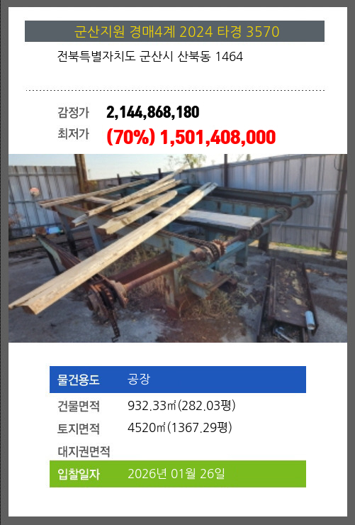 사건번호 2024 타경 3570 본건은 전북특별자치도 군산시 산북동 1464소재하는 공장경매 물건의 포스팅입니다. 건물면적 [ 932.33㎡ (282.03평) ]토지면적 [ 4520㎡ (1367.29평) ] 시세를 반영한 감정가 2,144,868,180에서1회