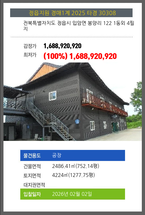 사건번호 2025 타경 30308 본건은 전북특별자치도 정읍시 입암면 봉양리 122 1동외 4필지소재하는 공장경매 물건의 포스팅입니다. 건물면적 [ 2486.41㎡ (752.14평) ]토지면적 [ 4224㎡ (1277.75평) ] 시세를