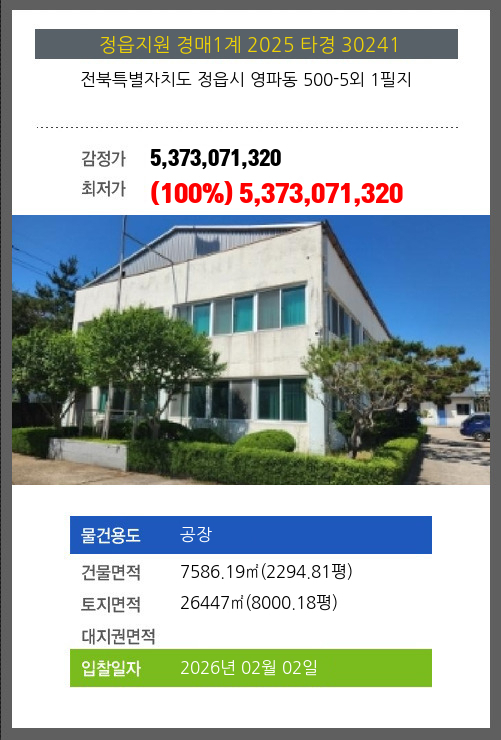 사건번호 2025 타경 30241 본건은 전북특별자치도 정읍시 영파동 500-5외 1필지소재하는 공장경매 물건의 포스팅입니다. 건물면적 [ 7586.19㎡ (2294.81평) ]토지면적 [ 26447㎡ (8000.18평) ] 시세를 반영한 감정가