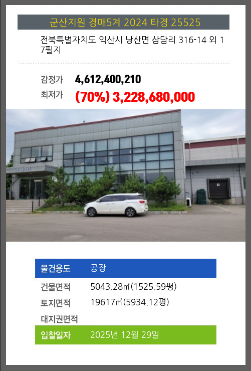 사건번호 2024 타경 25525 본건은 전북특별자치도 익산시 낭산면 삼담리 316-14 외 17필지소재하는 공장경매 물건의 포스팅입니다. 건물면적 [ 5043.28㎡ (1525.59평) ]토지면적 [ 19617㎡ (5934.12평) ] 시세를