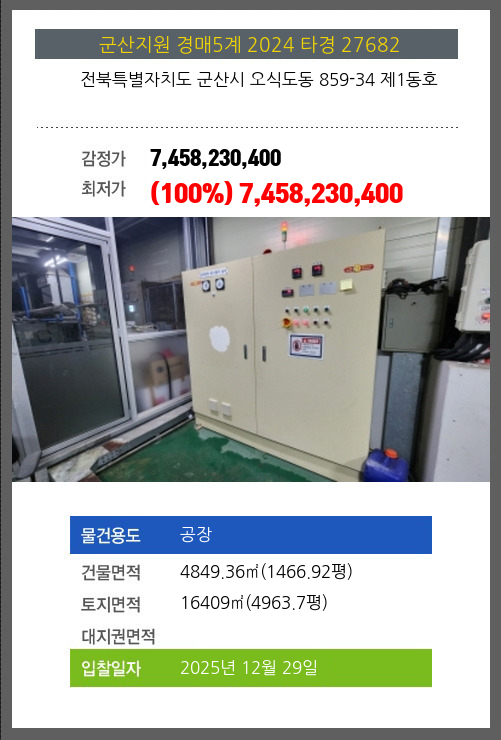 사건번호 2024 타경 27682 본건은 전북특별자치도 군산시 오식도동 859-34 제1동호소재하는 공장경매 물건의 포스팅입니다. 건물면적 [ 4849.36㎡ (1466.92평) ]토지면적 [ 16409㎡ (4963.7평) ] 시세를 반영한 감정가