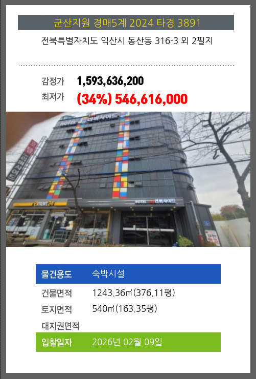 사건번호 2024 타경 3891 본건은 전북특별자치도 익산시 동산동 316-3 외 2필지소재하는 숙박시설경매 물건의 포스팅입니다. 건물면적 [ 1243.36㎡ (376.11평) ]토지면적 [ 540㎡ (163.35평) ] 시세를 반영한