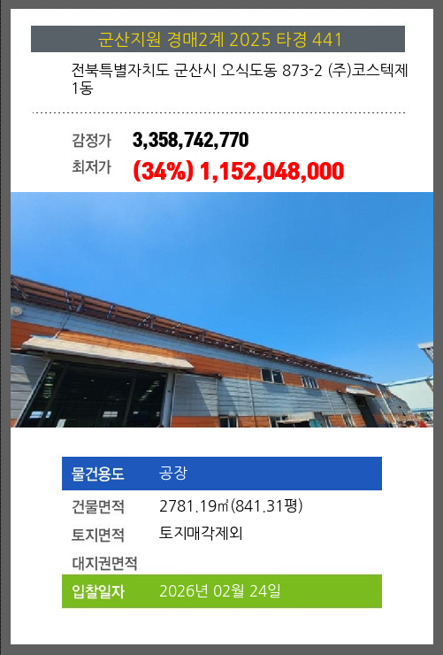 사건번호 2025 타경 441 본건은 전북특별자치도 군산시 오식도동 873-2 (주)코스텍제1동소재하는 공장경매 물건의 포스팅입니다. 건물면적 [ 2781.19㎡ (841.31평) ]토지면적 [ 토지 매각제외 ] 시세를 반영한 감정가