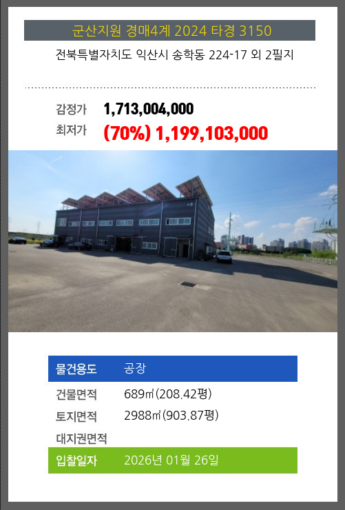 사건번호 2024 타경 3150 본건은 전북특별자치도 익산시 송학동 224-17 외 2필지소재하는 공장경매 물건의 포스팅입니다. 건물면적 [ 689㎡ (208.42평) ]토지면적 [ 2988㎡ (903.87평) ] 시세를 반영한
