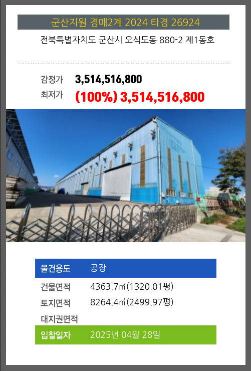 사건번호 2024 타경 26924 본건은 전북특별자치도 군산시 오식도동 880-2 제1동호소재하는 공장경매 물건의 포스팅입니다. 건물면적 [ 4363.7㎡ (1320.01평) ]토지면적 [ 8264.4㎡ (2499.97평) ] 시세를 반영한 감정가