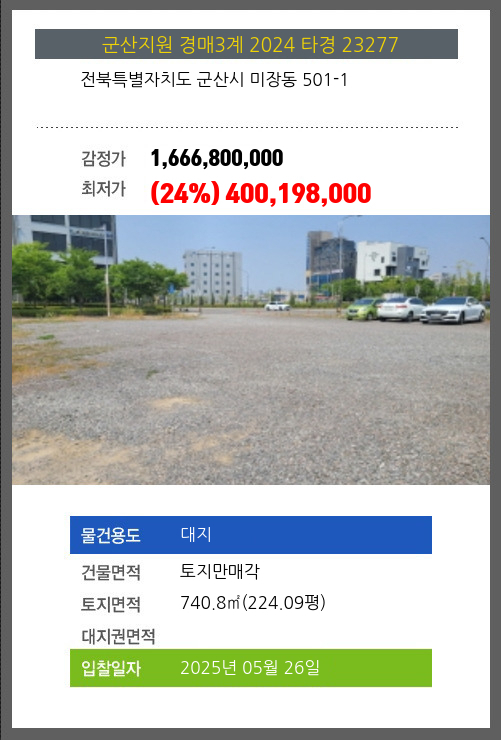 사건번호 2024 타경 23277 본건은 전북특별자치도 군산시 미장동 501-1소재하는 대지경매 물건의 포스팅입니다. 건물면적 [ 토지만매각 ]토지면적 [ 740.8㎡ (224.09평) ] 시세를 반영한 감정가 1,666,800,000에서2회 유찰되어