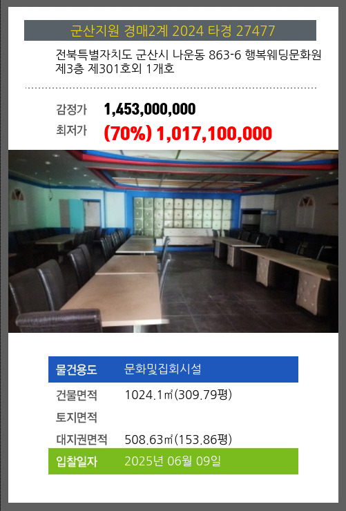 사건번호 2024 타경 27477 본건은 전북특별자치도 군산시 나운동 863-6 행복웨딩문화원 제3층 제301호외 1개호소재하는 문화및집회시설경매 물건의 포스팅입니다. 건물면적 [ 1024.1㎡ (309.79평) ]대지권 [ 508.63㎡ (153.86평) ]