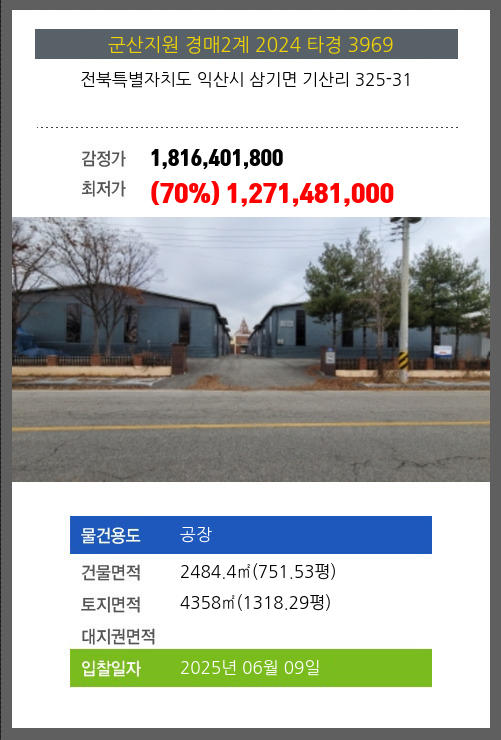 사건번호 2024 타경 3969 본건은 전북특별자치도 익산시 삼기면 기산리 325-31소재하는 공장경매 물건의 포스팅입니다. 건물면적 [ 2484.4㎡ (751.53평) ]토지면적 [ 4358㎡ (1318.29평) ] 시세를 반영한 감정가