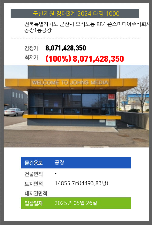 사건번호 2024 타경 1000 본건은 전북특별자치도 군산시 오식도동 884 존스미디어주식회사공장1동공장소재하는 공장경매 물건의 포스팅입니다. 토지면적 [ 14855.7㎡ (4493.83평) ] 시세를 반영한 감정가 8,071,428,350에서신건으로 감정가 대비 100%최저가