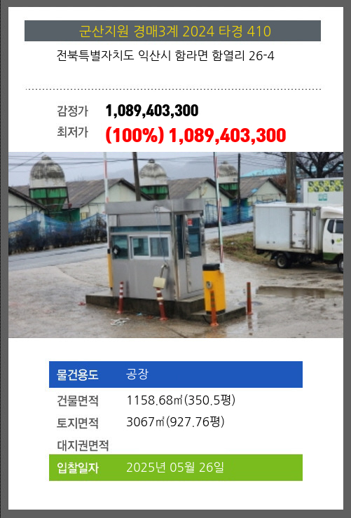 사건번호 2024 타경 410 본건은 전북특별자치도 익산시 함라면 함열리 26-4소재하는 공장경매 물건의 포스팅입니다. 건물면적 [ 1158.68㎡ (350.5평) ]토지면적 [ 3067㎡ (927.76평) ] 시세를 반영한 감정가