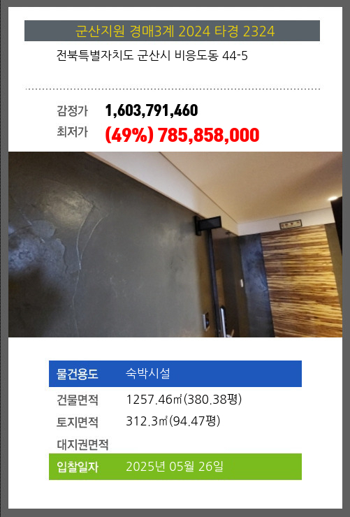 사건번호 2024 타경 2324 본건은 전북특별자치도 군산시 비응도동 44-5소재하는 숙박시설경매 물건의 포스팅입니다. 건물면적 [ 1257.46㎡ (380.38평) ]토지면적 [ 312.3㎡ (94.47평) ] 시세를 반영한 감정가 1,603,791,460에서2회