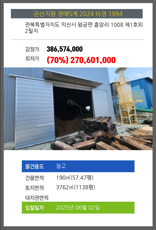 사건번호 2024 타경 1994 본건은 전북특별자치도 익산시 왕궁면 흥암리 1008 제1호외 2필지소재하는 창고경매 물건의 포스팅입니다. 건물면적 [ 190㎡ (57.47평) ]토지면적 [ 3762㎡ (1138평) ] 시세를