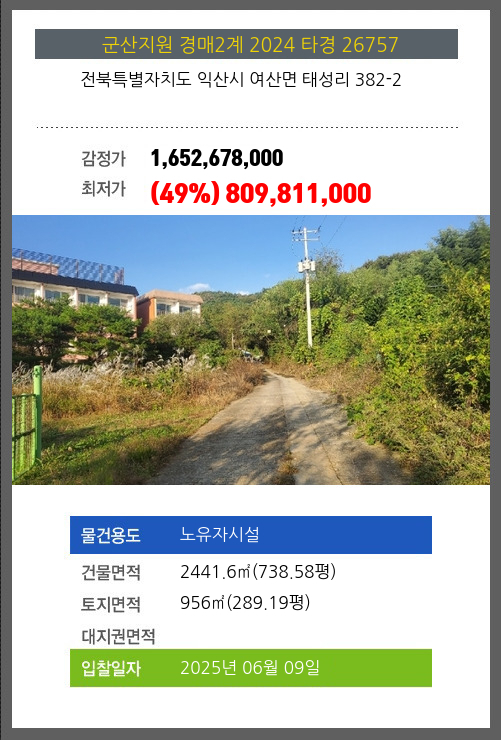 사건번호 2024 타경 26757 본건은 전북특별자치도 익산시 여산면 태성리 382-2소재하는 노유자시설경매 물건의 포스팅입니다. 건물면적 [ 2441.6㎡ (738.58평) ]토지면적 [ 956㎡ (289.19평) ] 시세를 반영한 감정가