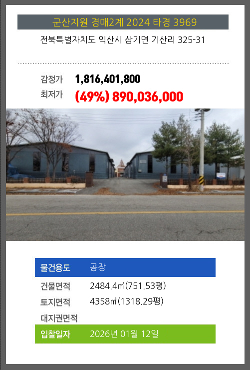 사건번호 2024 타경 3969 본건은 전북특별자치도 익산시 삼기면 기산리 325-31소재하는 공장경매 물건의 포스팅입니다. 건물면적 [ 2484.4㎡ (751.53평) ]토지면적 [ 4358㎡ (1318.29평) ] 시세를 반영한 감정가