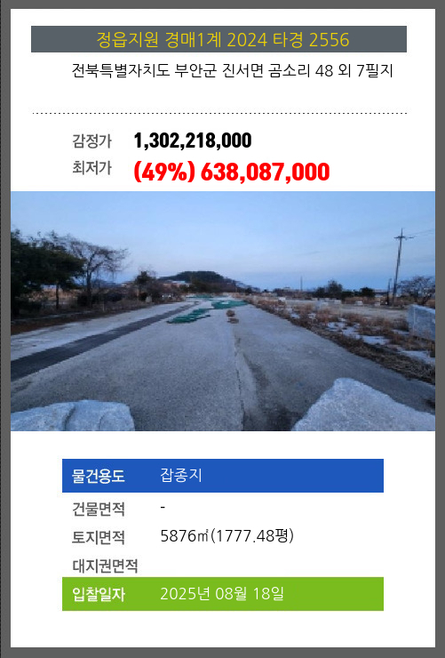 사건번호 2024 타경 2556 본건은 전북특별자치도 부안군 진서면 곰소리 48 외 7필지소재하는 잡종지경매 물건의 포스팅입니다. 토지면적 [ 5876㎡ (1777.48평) ] 시세를 반영한 감정가 1,302,218,000에서2회 유찰되어