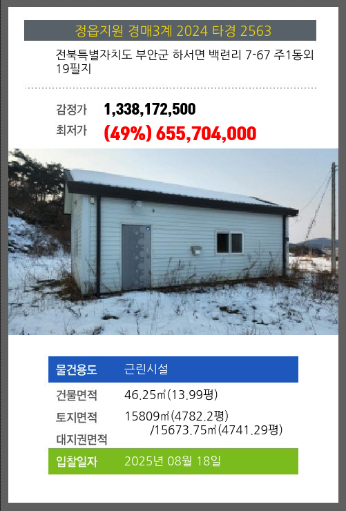 사건번호 2024 타경 2563 본건은 전북특별자치도 부안군 하서면 백련리 7-67 주1동외 19필지소재하는 근린시설경매 물건의 포스팅입니다. 건물면적 [ 46.25㎡ (13.99평) ]토지면적 [ 전체:15809㎡ (4782.2평) 매각지분:15673.75㎡ (4741.29평)