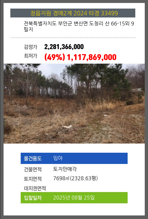 사건번호 2024 타경 33499 본건은 전북특별자치도 부안군 변산면 도청리 산 66-15외 9필지소재하는 임야경매 물건의 포스팅입니다. 건물면적 [ 토지만매각 ]토지면적 [ 7698㎡ (2328.63평) ] 시세를 반영한