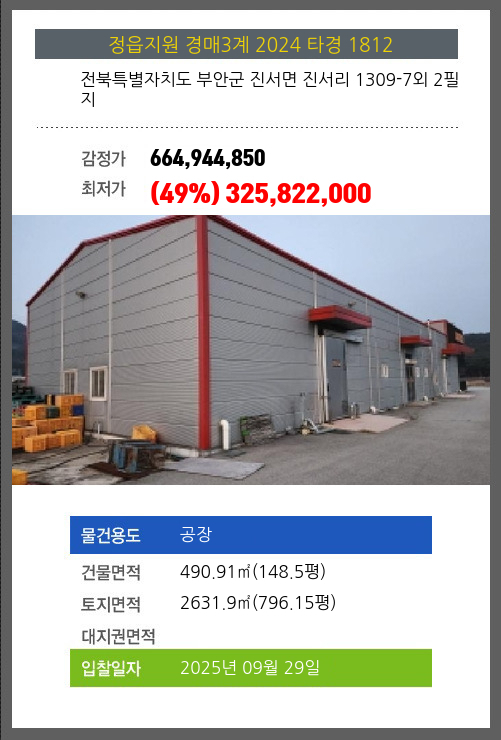사건번호 2024 타경 1812 본건은 전북특별자치도 부안군 진서면 진서리 1309-7외 2필지소재하는 공장경매 물건의 포스팅입니다. 건물면적 [ 490.91㎡ (148.5평) ]토지면적 [ 2631.9㎡ (796.15평) ] 시세를 반영한