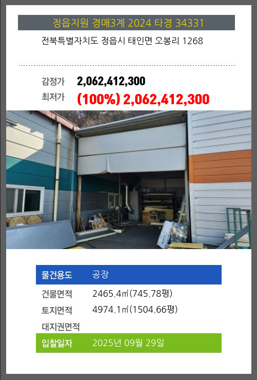 사건번호 2024 타경 34331 본건은 전북특별자치도 정읍시 태인면 오봉리 1268소재하는 공장경매 물건의 포스팅입니다. 건물면적 [ 2465.4㎡ (745.78평) ]토지면적 [ 4974.1㎡ (1504.66평) ] 시세를 반영한 감정가