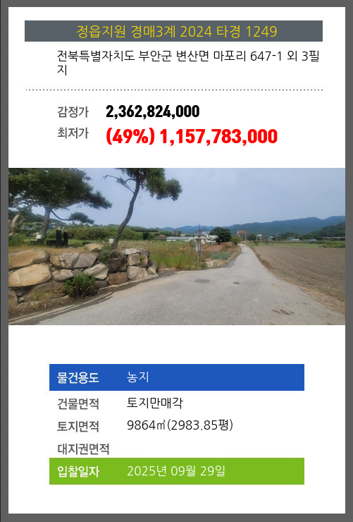 사건번호 2024 타경 1249 본건은 전북특별자치도 부안군 변산면 마포리 647-1 외 3필지소재하는 농지경매 물건의 포스팅입니다. 건물면적 [ 토지만매각 ]토지면적 [ 9864㎡ (2983.85평) ] 시세를 반영한