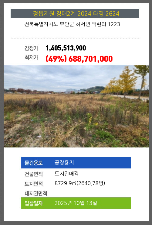 사건번호 2024 타경 2624 본건은 전북특별자치도 부안군 하서면 백련리 1223소재하는 공장용지경매 물건의 포스팅입니다. 건물면적 [ 토지만매각 ]토지면적 [ 8729.9㎡ (2640.78평) ] 시세를 반영한 감정가 1,405,513,900에서2회