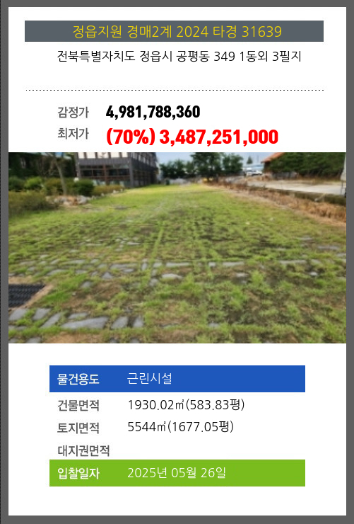 사건번호 2024 타경 31639 본건은 전북특별자치도 정읍시 공평동 349 1동외 3필지소재하는 근린시설경매 물건의 포스팅입니다. 건물면적 [ 1930.02㎡ (583.83평) ]토지면적 [ 5544㎡ (1677.05평) ] 시세를 반영한