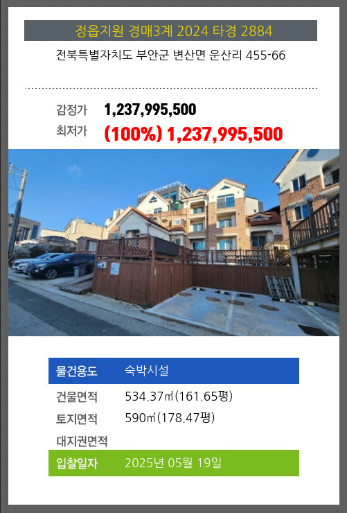 사건번호 2024 타경 2884 본건은 전북특별자치도 부안군 변산면 운산리 455-66소재하는 숙박시설경매 물건의 포스팅입니다. 건물면적 [ 534.37㎡ (161.65평) ]토지면적 [ 590㎡ (178.47평) ] 시세를 반영한 감정가
