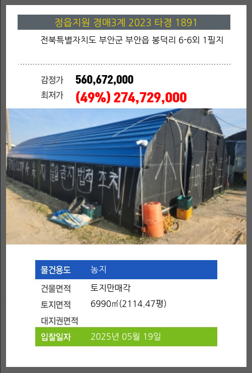 사건번호 2023 타경 1891 본건은 전북특별자치도 부안군 부안읍 봉덕리 6-6외 1필지소재하는 농지경매 물건의 포스팅입니다. 건물면적 [ 토지만매각 ]토지면적 [ 6990㎡ (2114.47평) ] 시세를 반영한 감정가