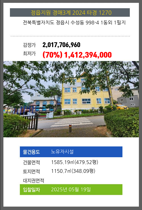 사건번호 2024 타경 1270 본건은 전북특별자치도 정읍시 수성동 998-4 1동외 1필지소재하는 노유자시설경매 물건의 포스팅입니다. 건물면적 [ 1585.19㎡ (479.52평) ]토지면적 [ 1150.7㎡ (348.09평) ] 시세를 반영한