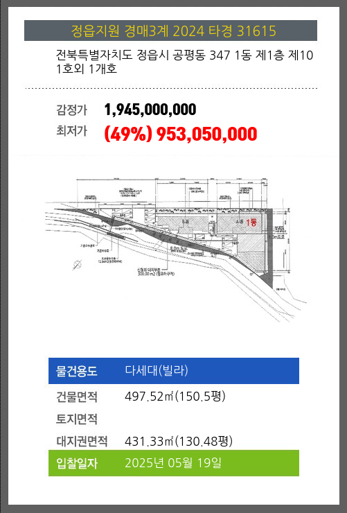 사건번호 2024 타경 31615 본건은 전북특별자치도 정읍시 공평동 347 1동 제1층 제101호외 1개호소재하는 다세대(빌라)경매 물건의 포스팅입니다. 건물면적 [ 497.52㎡ (150.5평) ]대지권 [ 431.33㎡ (130.48평) ]