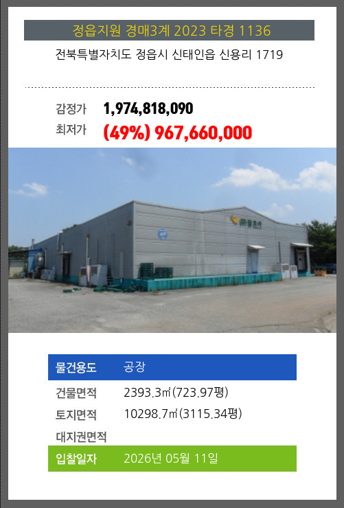 사건번호 2023 타경 1136 본건은 전북특별자치도 정읍시 신태인읍 신용리 1719소재하는 공장경매 물건의 포스팅입니다. 건물면적 [ 2393.3㎡ (723.97평) ]토지면적 [ 10298.7㎡ (3115.34평) ] 시세를 반영한 감정가