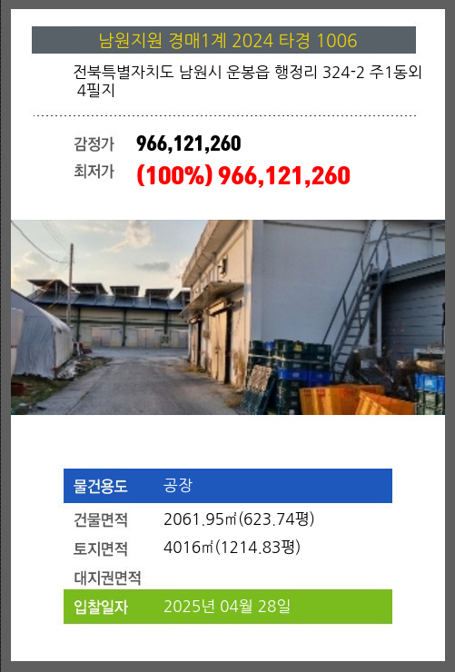 사건번호 2024 타경 1006 본건은 전북특별자치도 남원시 운봉읍 행정리 324-2 주1동외 4필지소재하는 공장경매 물건의 포스팅입니다. 건물면적 [ 2061.95㎡ (623.74평) ]토지면적 [ 4016㎡ (1214.83평) ] 시세를