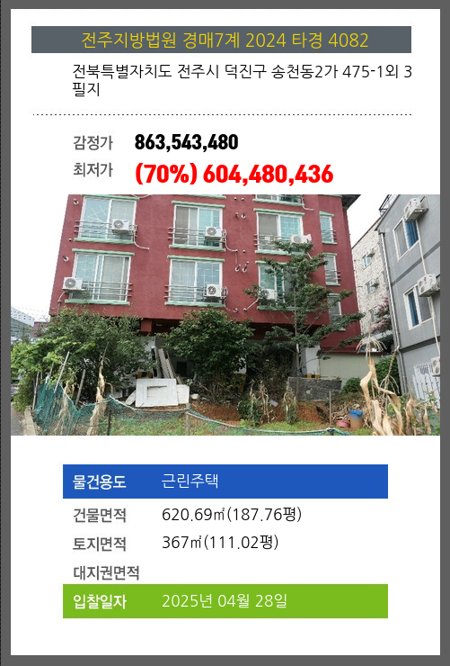 사건번호 2024 타경 4082 본건은 전북특별자치도 전주시 덕진구 송천동2가 475-1외 3필지소재하는 근린주택경매 물건의 포스팅입니다. 건물면적 [ 620.69㎡ (187.76평) ]토지면적 [ 367㎡ (111.02평) ] 시세를 반영한