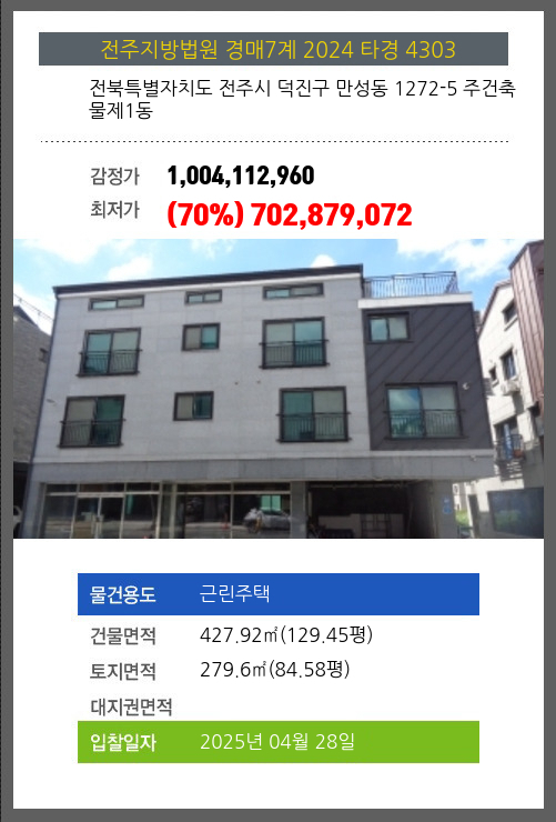 사건번호 2024 타경 4303 본건은 전북특별자치도 전주시 덕진구 만성동 1272-5 주건축물제1동소재하는 근린주택경매 물건의 포스팅입니다. 건물면적 [ 427.92㎡ (129.45평) ]토지면적 [ 279.6㎡ (84.58평) ] 시세를 반영한