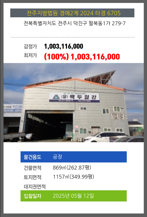 사건번호 2024 타경 6705 본건은 전북특별자치도 전주시 덕진구 팔복동1가 279-7소재하는 공장경매 물건의 포스팅입니다. 건물면적 [ 869㎡ (262.87평) ]토지면적 [ 1157㎡ (349.99평) ] 시세를 반영한 감정가
