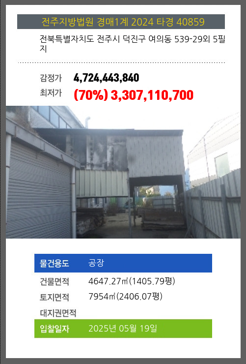 사건번호 2024 타경 40859 본건은 전북특별자치도 전주시 덕진구 여의동 539-29외 5필지소재하는 공장경매 물건의 포스팅입니다. 건물면적 [ 4647.27㎡ (1405.79평) ]토지면적 [ 7954㎡ (2406.07평) ] 시세를 반영한